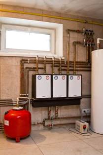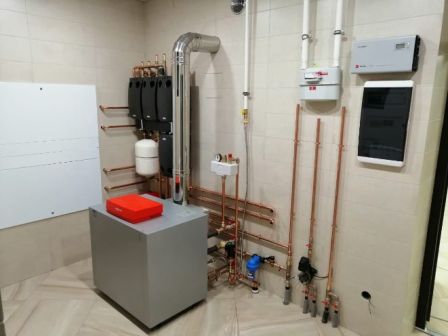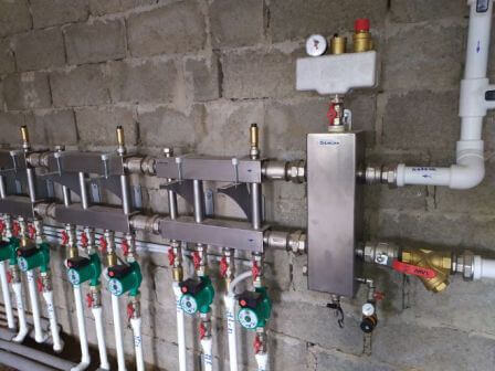 Котельная - выполнен монтаж газового котла 42 кВт, установлены группы быстрого монтажа с возможность установки сервоприводов для автоматического поэтажного регулирования
